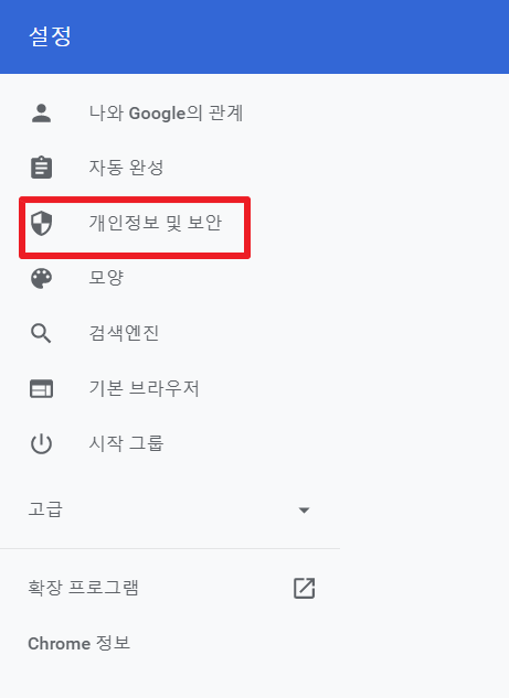 3.좌측에 있는 개인정보 및 보안을 클릭해줍니다.
